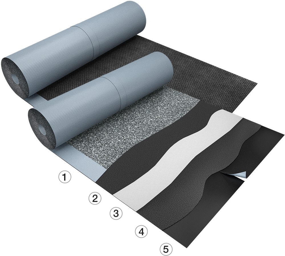Osnovne verzije: TEX mikro-poredna crna tkanina od netkane polipropilenske mase, sa preklopom na bočnoj strani od 10 cm sa silikonskim slojem za lako odvajanje Mineralne verzije: samoodbranjivi sivi ili obojeni listići škriljevca, sa preklopom na bočnoj strani od 10 cm sa silikonskim slojem za lako odvajanje