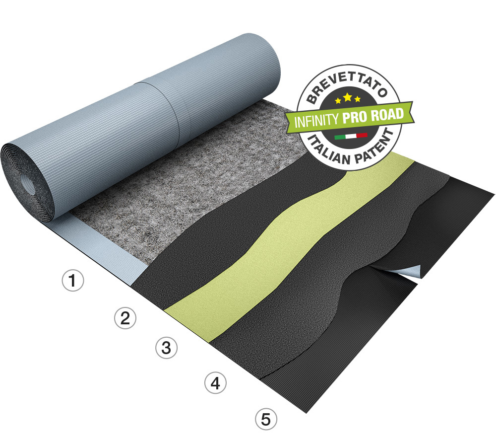 Geokompozitno višeslojno ojačanje sastavljeno od visokokvalitetnog nerastvorenog poliesterskog platna i višesmjernih staklenih vlakana.